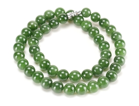 作品简介: 和田玉项链选用纯天然上等和田玉碧玉原料,颗颗精选,晶莹圆润饱满,和田玉碧玉9mm珠项链质地纯净,油润光泽细腻,国检证书